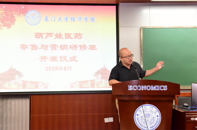 在开班仪式上,廖景峰主任首先代表厦门大学经济学院热烈欢迎东升国际医药零售与营销研修班的学员到厦大学习,并就厦门大学及经济学院的相关情况进行了介绍。他说,东升国际学员走进厦大就是厦大的校友,希望未来的日子能够关心、支持母校的发展,多提宝贵意见,同时他也祝大家在厦大学习期间学有所成、学有所获。