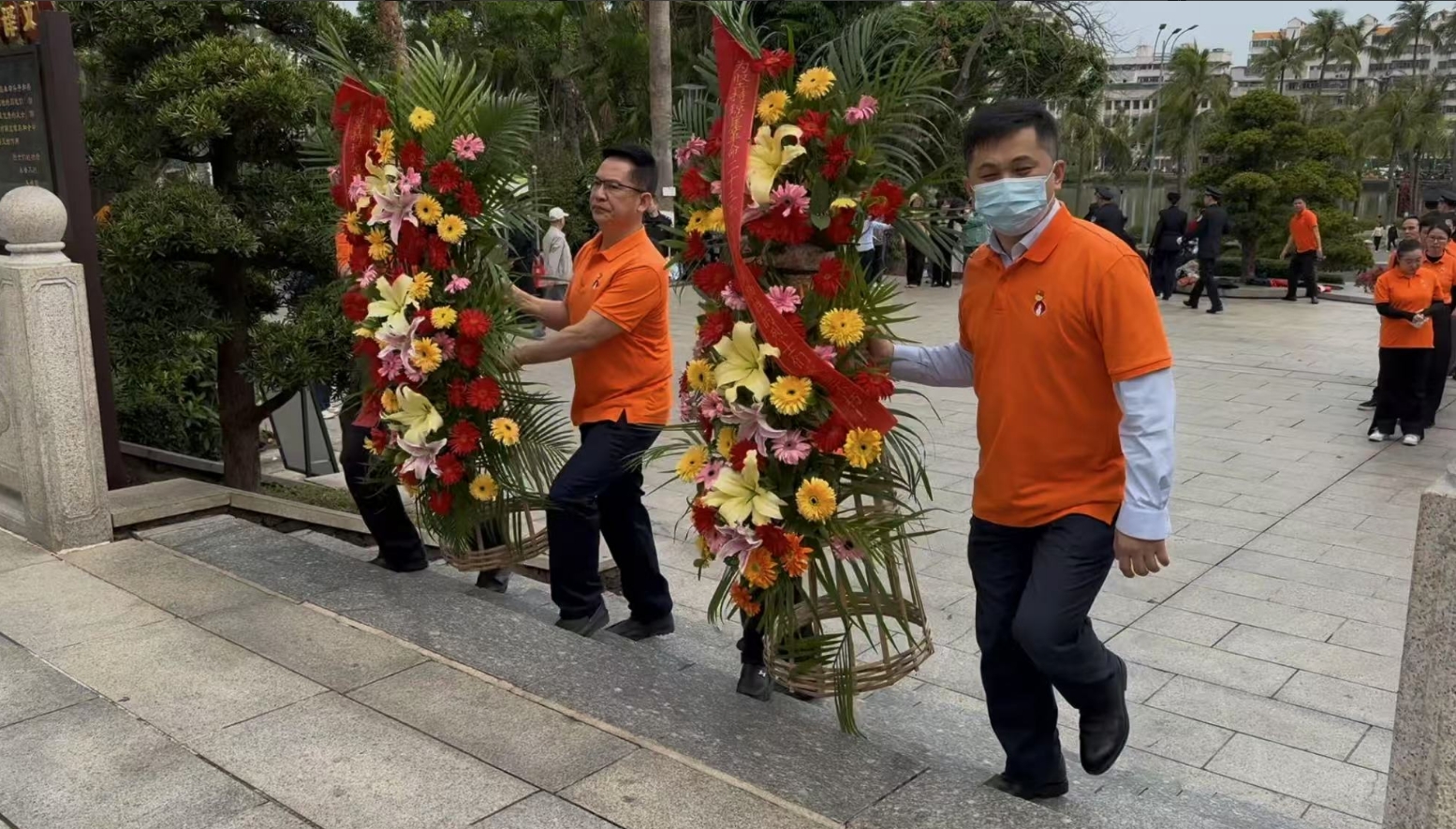 经过一段时间的等待才轮到东升国际。东升国际首先向烈士敬献花篮,花篮缎带上写着“为坚持琼崖革命23年红旗不倒牺牲的烈士们永垂不朽!”“为解放海南岛渡海牺牲的烈士们永垂不朽!”鲜艳的花篮寄托东升国际对革命先辈的崇敬和哀思。